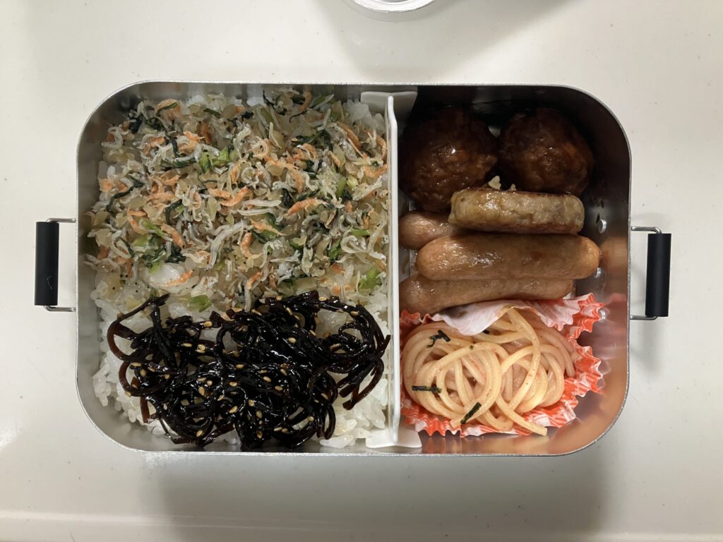 おかずは全部冷食。肉団子、ウインナー、ハンバーグ、しゅうまい、パスタ。