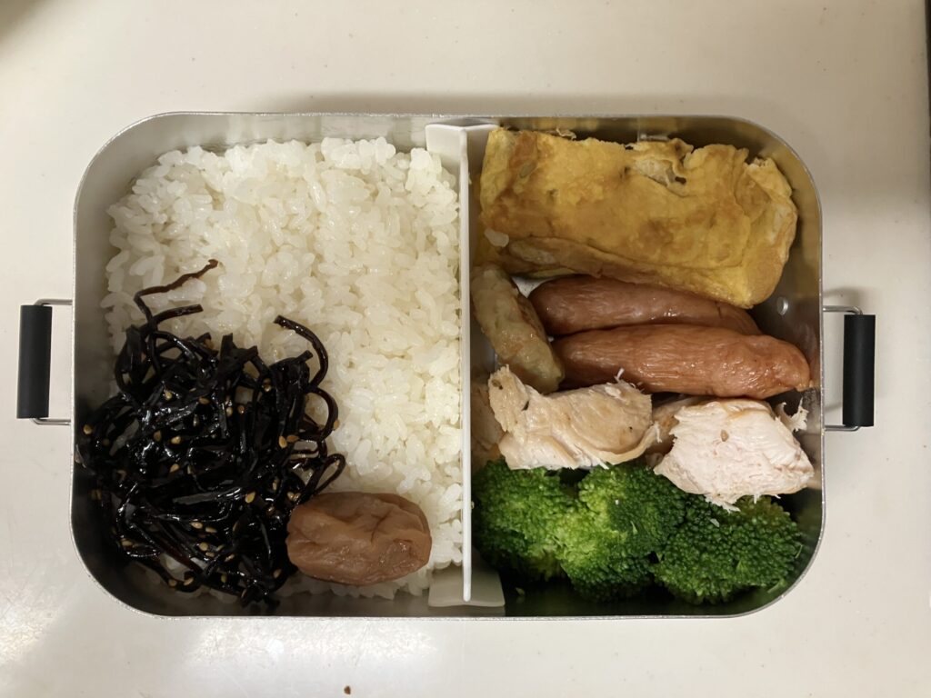 肉系が3種類。ウインナー、ハンバーグ、鶏肉。たんぱく質たっぷり。腹持ちいい。
