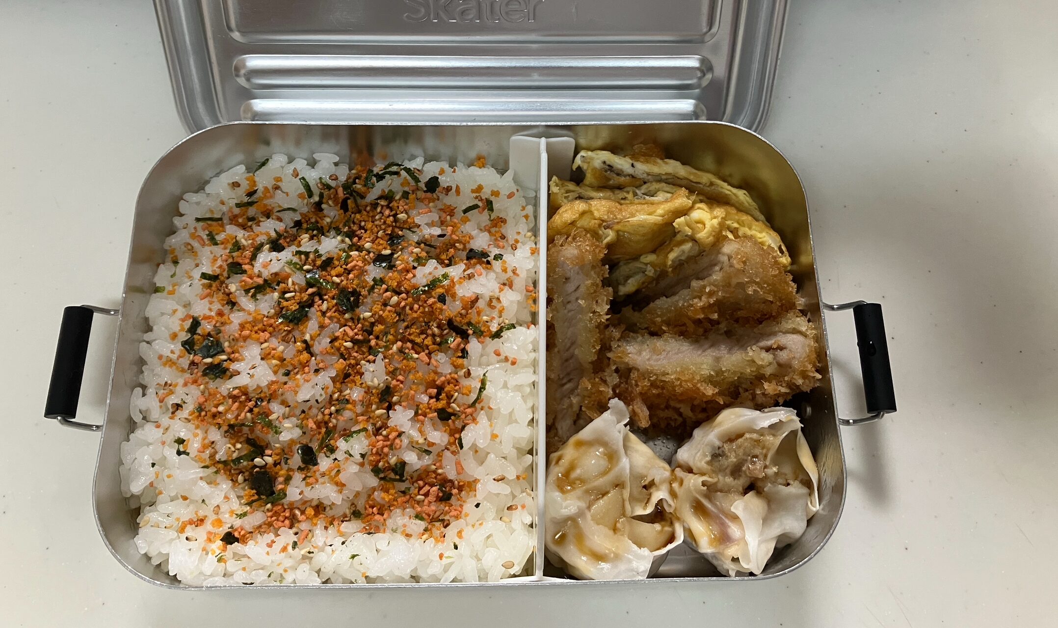 (内訳:ごはん70円、ふりかけ8円、卵30円、とんかつ(残り物)150円、冷凍食品100円)